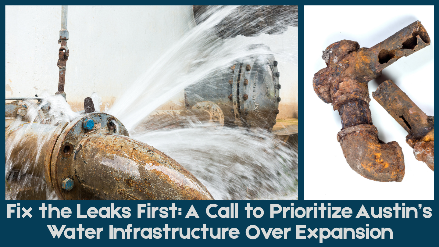 If you agree that Austin should prioritize fixing its failing infrastructure before expanding supply, take a moment to speak up now. Use the form letter below to contact the Water and Wastewater Commission and the Water Forward Task Force to press City leadership toward smarter, more responsible water management. We urge you to add your own voice by including a short, personal message.